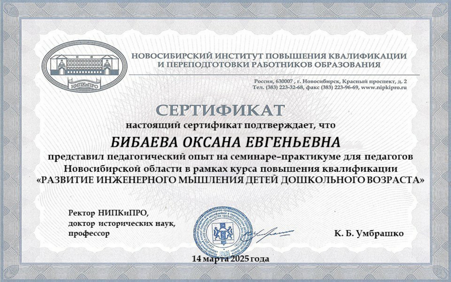 Сертификат подтверждающий, что представила педагогический опыт на семинаре-практикуме для педагогов Новосибирской области в рамках курса повышения квалификации "РАЗВИТИЕ ИНЖЕНЕРНОГО МЫШЛЕНИЯ ДЕТЕЙ ДОШКОЛЬНОГО ВОЗРАСТА"