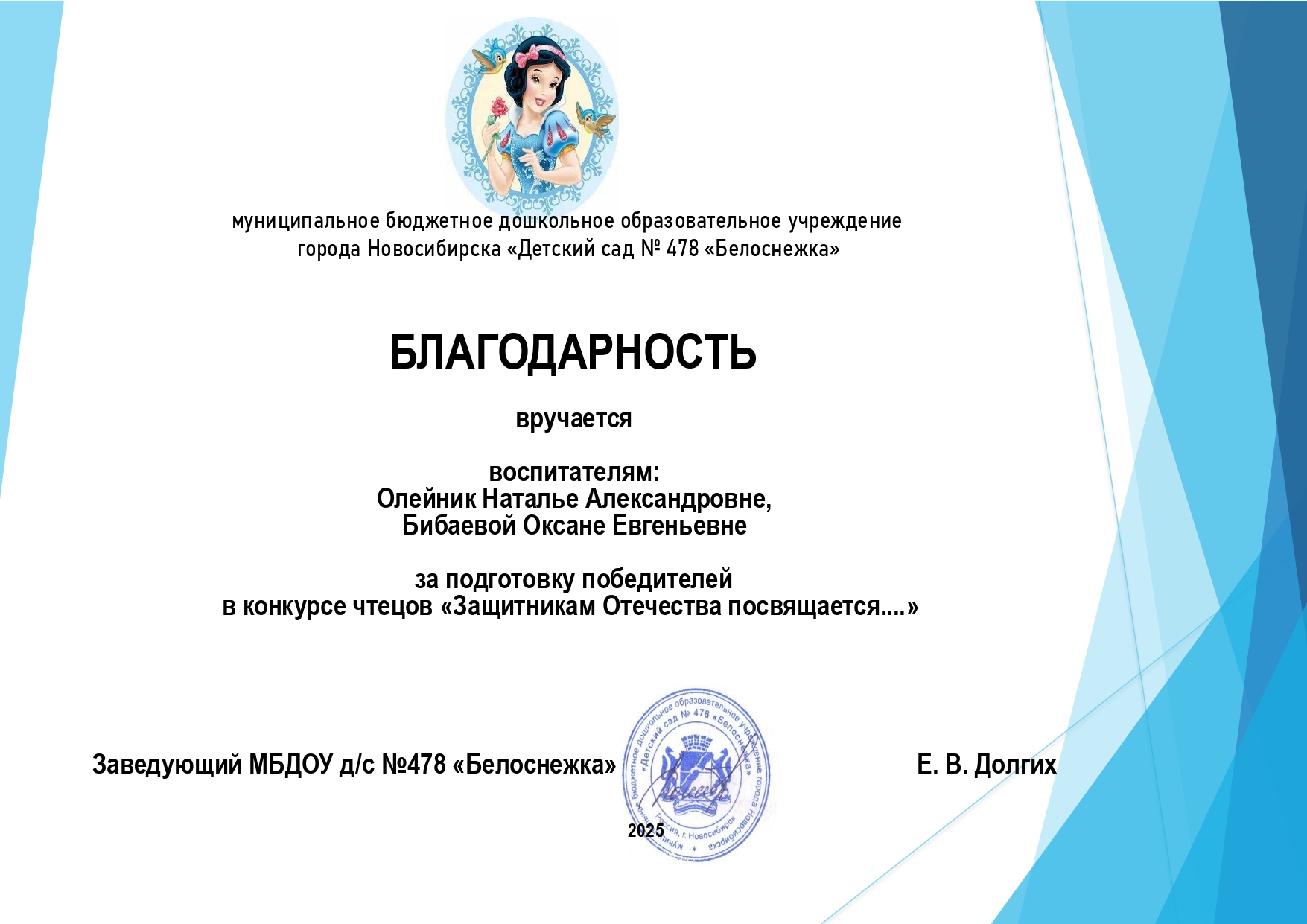 Благодарность за подготовку победителей в конкурсе чтецов "Защитникам Отечества посвящается..." 23.10.2025 г.