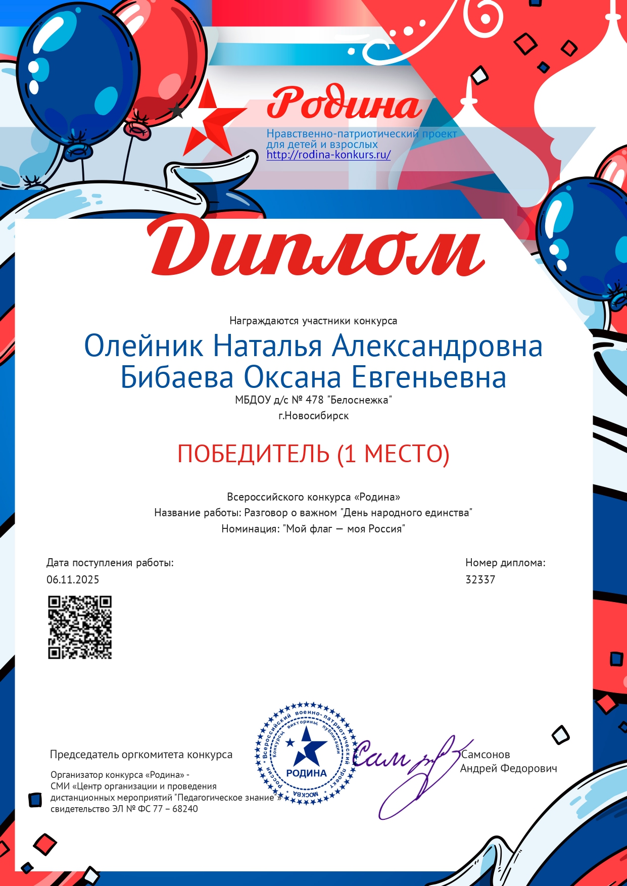 Диплом всероссийского конкурса «Родина» Название работы: Разговор о важном "День народного единства" Номинация: "Мой флаг — моя Россия", Победитель 1 место, 2025 год
