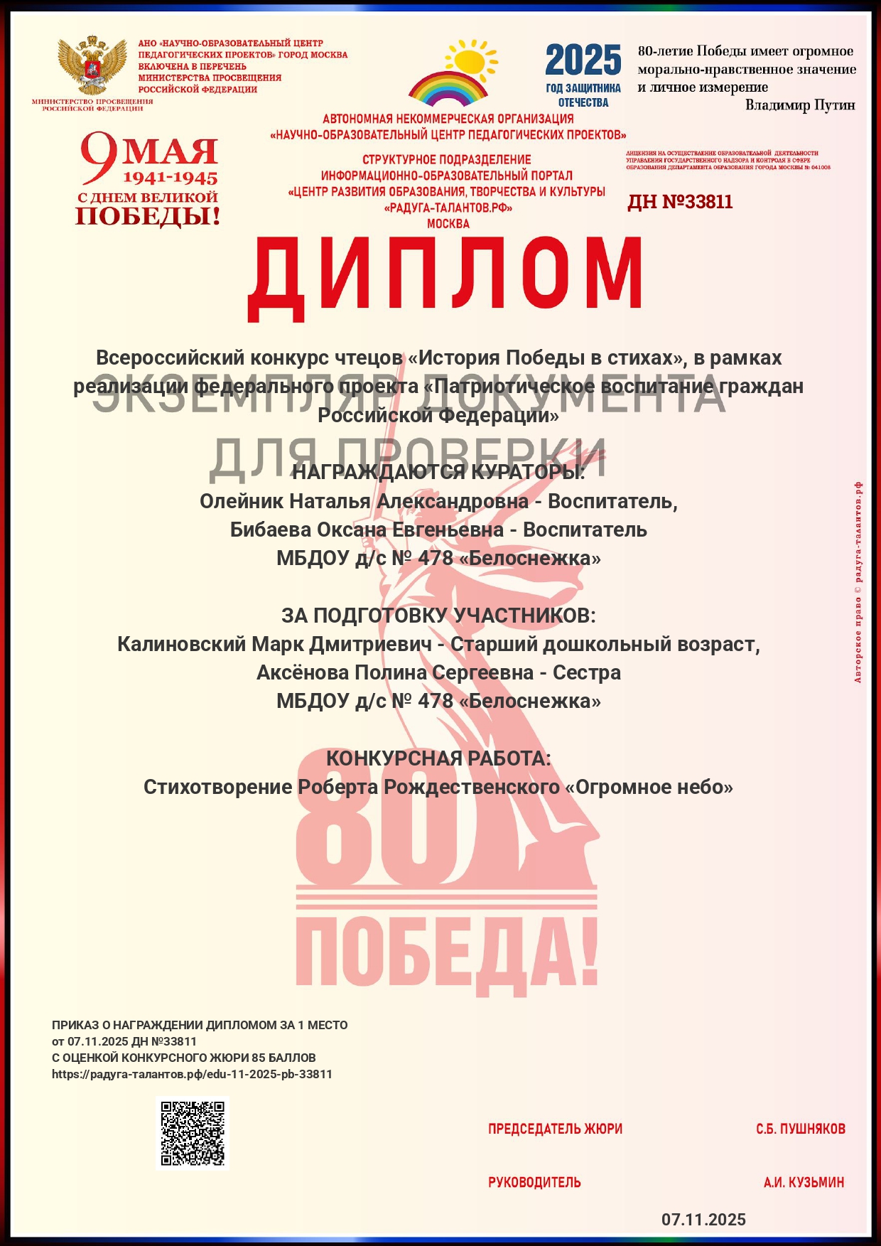 Диплом куратора Всероссийского конкурса чтецов «История Победы в стихах», в рамках реализации федерального проекта «Патриотическое воспитание граждан Российской Федерации»ЗА ПОДГОТОВКУ УЧАСТНИКОВ: Калиновский Марк Дмитриевич - Старший дошкольный возраст, Аксёнова Полина Сергеевна - Сестра, МБДОУ д/с № 478 «Белоснежка», КОНКУРСНАЯ РАБОТА: Стихотворение Роберта Рождественского «Огромное небо», 2025 год